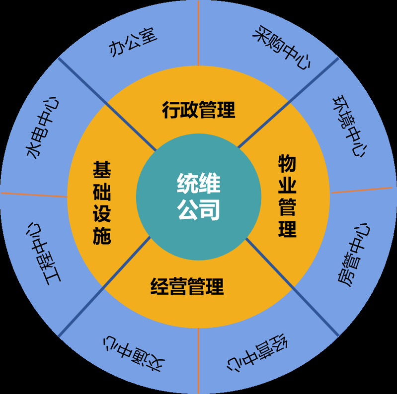 调整后的统维后勤划分为行政管理、物业管理、经营管理及基础设施四大板块,下设综合办公室、采购中心、环境中心、房管中心、经营中心、交通中心、工程中心、水电中心等8个中心,为9728太阳集团提供全方位的后勤保障服务。