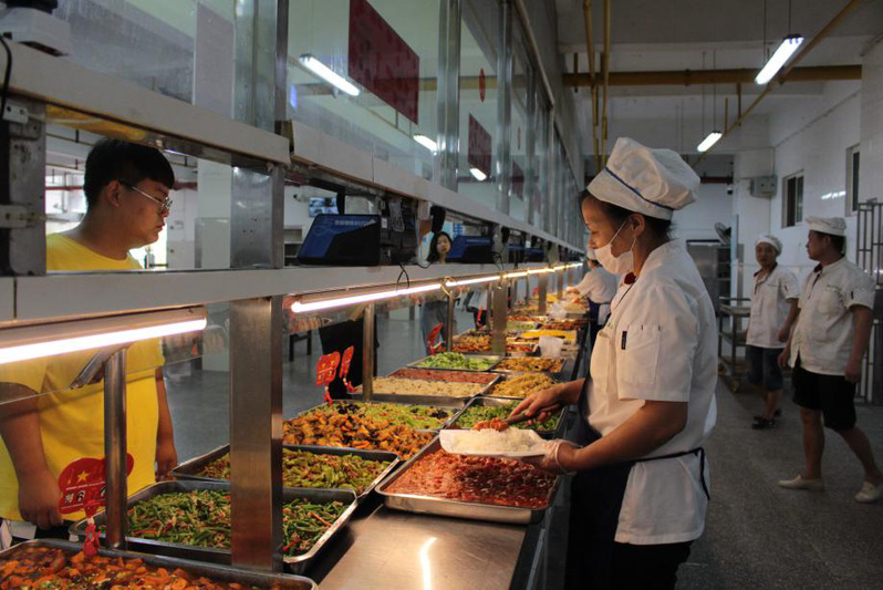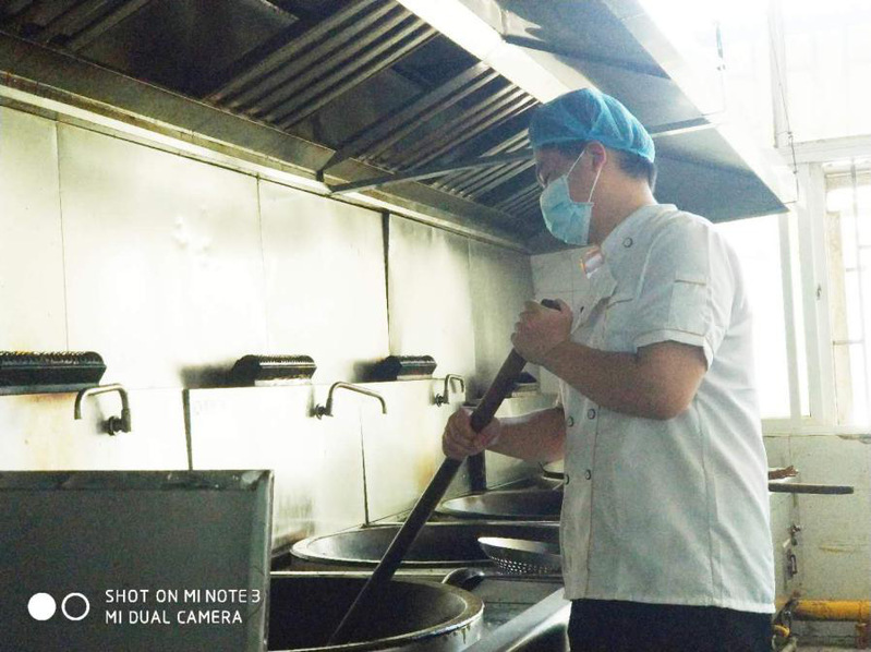 后勤集团食堂员工始终坚守岗位,厨师伴随着炙热的炉火,在厨房中挥动着大勺,蒸饭师傅在像蒸笼一样的蒸饭间倒米、蒸饭、装箱,保洁师傅在师生就餐时随时清理餐桌上的遗留垃圾、清理餐具……每一个平凡的岗位都有着不平凡的付出。
