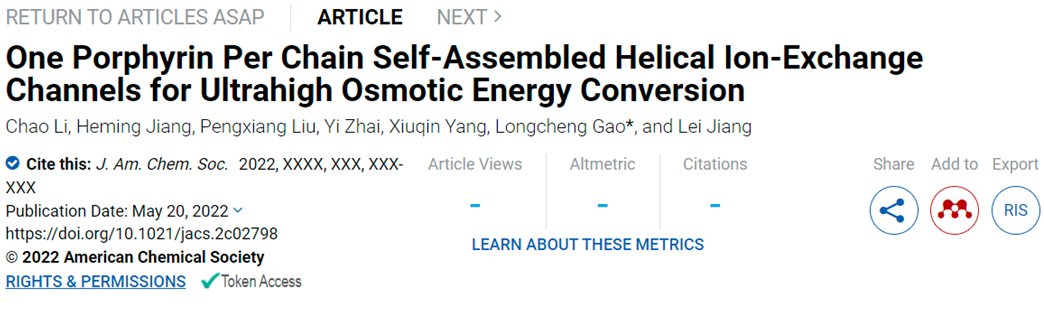 2022年5月20日,Journal of the American Chemical Society 在线发表了买球体育江雷院士、高龙成副教授团队在高效离子交换膜方面的最新研究成果:“One Porphyrin Per Chain Self-Assembled Helical Ion-Exchange Channels for Ultrahigh Osmotic Energy Conversion”。买球体育官方网站博士生李超为第一作者,高龙成副教授为通讯作者,买球体育官方网站买球体育官方网站为第一单位。