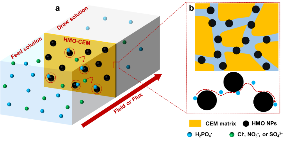 文章指出,基于静电相互作用、尺寸效应和化学结合能作用是目前主流的离子分离策略,可以实现较好的阴/阳离子或者单价/多价离子的分离。但是在特定离子提取方面,特别是对于具有相同电荷、相似半径、水合能的离子(如H2PO4-/Cl-)就存在很大困难了。文章对美国加州大学洛杉矶分校David Jassby教授发表于同期Nature Nanotechnology的工作进行了总结和评价,积极肯定了“二氧化锰/阳离子交换膜”的复合膜设计理念及机理研究探索。因为水合二氧化锰表面具有能与H2PO4-相互作用的特异性结合位点,这为H2PO4-离子的选择性传输提供了可能。尽管复合膜主体是阳离子选择性膜,但出人意料地表现出阴离子选择性传输。最后,结合离子交换膜的实际应用场景提出了H2PO4-离子通量不足的问题,并且给出了通过纳米粒子的有序排列以优化“选择性-通量”关系的解决方案,最终在特种单一离子的筛分领域实现广泛的应用。