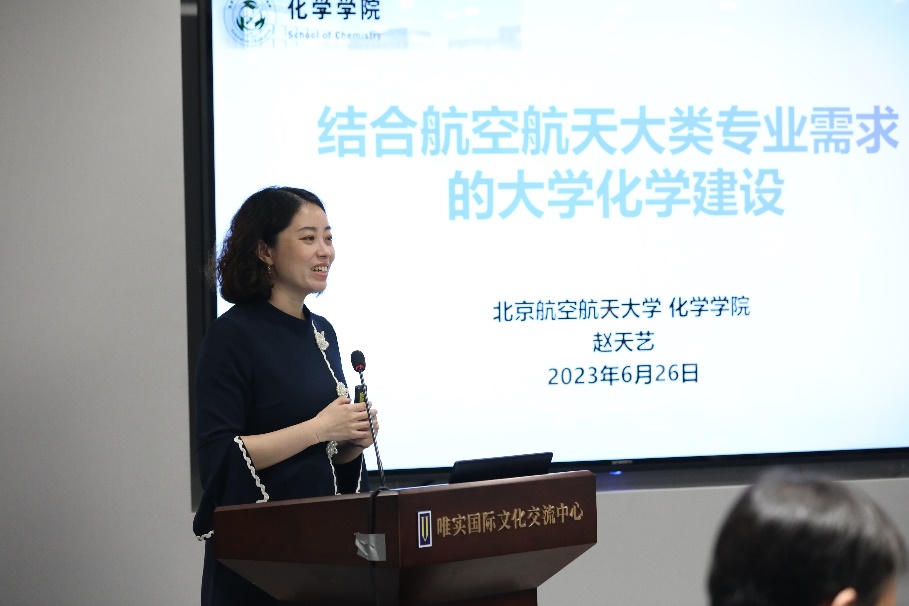 最后,北航买球体育官方网站院长助理赵天艺以“结合航空航天大类专业需求的大学化学建设”为主题展开报告。报告就北航买球体育官方网站所开设的大学化学课程基本情况、师资力量、建设成果等内容总体介绍了该课程建设现状,并结合空天特色,针对不同学生专业背景,提出“因材施教”的大学化学课程建设目标。同时,也对大学化学课程建设中面临的如何在有限学时内结合各专业所需,有效发挥化学基础学科的作用等问题,提出了大学化学课程建设的改革思路和举措。