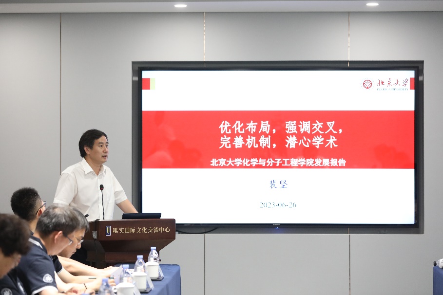 首先,北京大学化学与分子工程学院党委书记、国家教学名师裴坚教授进行“优化布局强调交叉完善机制潜心学术”主题报告。裴坚教授首先对北航买球体育官方网站十五周年表示祝贺。秉持“核心下沉,两翼张开,布局AI化学、新化工”发展理念,北京大学化学与分子工程学院对人才制度不断进行创新改革,坚持基础学科贯通式人才培养目标,营造浓厚学术氛围,增强产学结合。