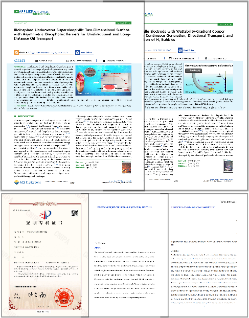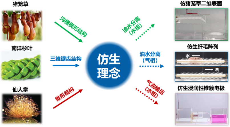 含油废水中油滴问题造成了严重的生态污染,电极反应界面气泡问题严重阻碍了电解水反应的效率,而这些问题都属于界面流体范畴。生物体具有优异的界面流体输运能力。例如,仙人掌、猪笼草和南洋杉叶具有特殊的界面结构,可以实现流体的连续、定向输运。在本项目从仿生理念出发,通过学习猪笼草的沟槽楔形结构,发展了仿猪笼草二维表面,实现了水相的油水分离;通过学习南洋杉叶的三维锯齿结构,发展了仿生纤毛阵列,实现了气相的油水分离;通过学习仙人掌刺的锥形刺结构,发展了仿生浸润性锥簇电极,实现了水相的气泡输运。