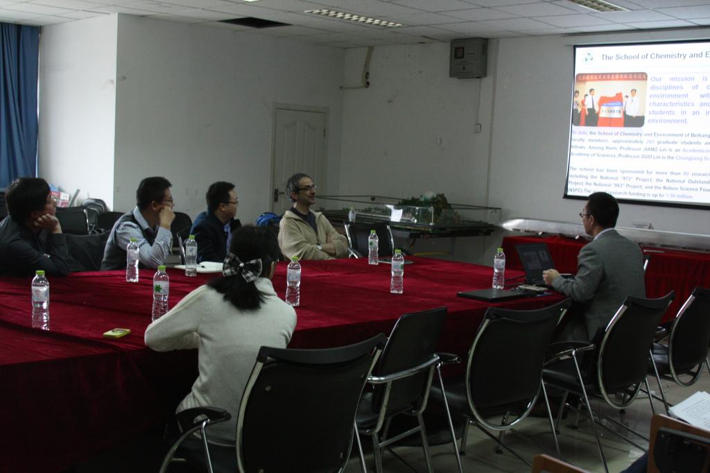 为进一步加强与国际知名大学的交流合作,应买球体育常务副院长郭林教授的邀请,比利时布鲁塞尔自由大学Michele Sferrazza教授访问了北航化学与环境学院。2016年3月31日上午,在北航为民楼743会议室,程群峰研究员主持了讨论会,孙艳明教授、张渊教授、王华副教授、李立东副教授参与了本次学术讨论。