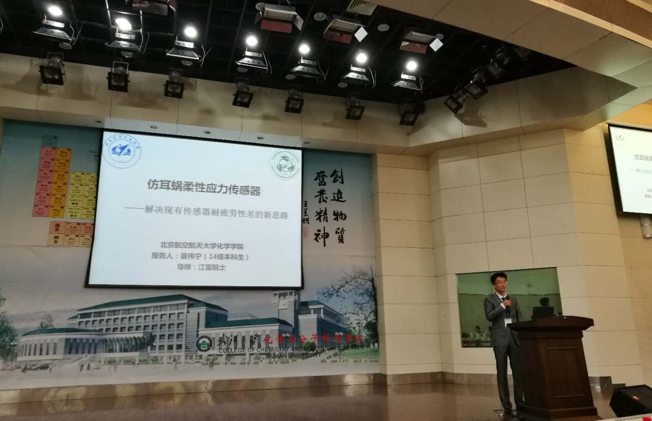 会中每个高校的代表队就校内前沿的化学创新项目进行了展示汇报,并在集中展示之后进行了科技创意评选。最终,由苗伟宁同学为研究队长的项目“仿耳蜗柔性应力传感器 - 解决现有传感器耐疲劳性差的新思路”在总排名中获得了第一名的优异成绩。