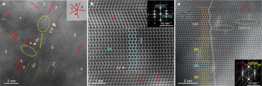 上图为: 15 GPa, 2000 °C条件下合成的纳米孪晶复合金刚石中非3C多型结构的HAADF-STEM像。 |