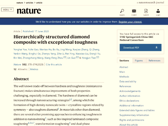 2020年6月18日,Nature杂志在线全文发表了买球体育郭林教授、岳永海教授团队与燕山大学田永君院士团队在纳米孪晶复合金刚石增韧机制方面的最新研究成果:“Hierarchically structured diamond composite with exceptional toughness”。岳永海教授、高宇飞博士、胡文涛教授、徐波教授为文章共同第一作者,周向峰教授、郭林教授、田永君院士为共同通讯作者。