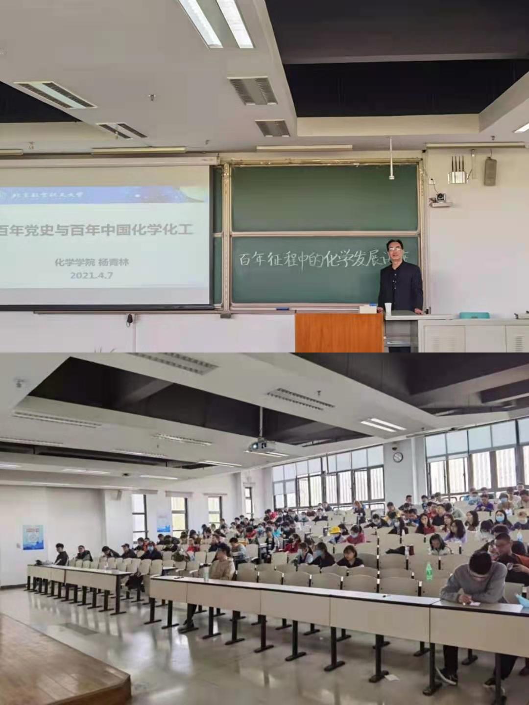 同一时间,学院邀请学院党委委员、立德树人优秀奖获得者杨青林老师在沙河校区J3-211为买球体育官方网站学生作题为“百年征程中的化学发展”主题报告。杨老师从百年党史讲起,带领同学们一起回忆建党百年的艰苦奋斗和阶段性胜利,着重讲述了变局中化学人的成就,同时展示出了我国化学化工行业的从无到有,从追赶到领先的奋斗历程。
