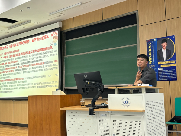 本次讲座由李思明老师主讲。李老师是中央党校法学专业硕士,中公教育总部特别研发院负责人、选调、乡镇项目负责人。李老师首先深入解读了考公的报考条件和报考时间安排,解答了关于考公常见的一些疑问,指出选调生具有晋升速度较快、竞争相对较小、可以跨省报考、省委组织部统一管理等诸多优势,鼓励同学们要紧紧抓住这一“上岸”机会,努力实现自身的职业目标。
