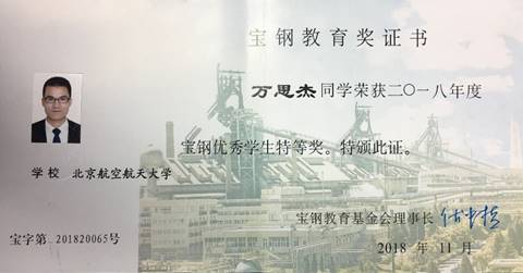 日前,买球体育博士研究生万思杰同学荣获2018年度宝钢优秀学生特等奖。经过学院及学校层层选拔,万思杰同学作为学校唯一一名学生代表,参加了宝钢优秀学生特等奖评审,并最终获得该奖项。