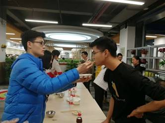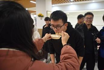 在第一锅饺子出锅后,我们的第一个游戏便开始了。首先我们进行的是抢水瓶游戏,买球体育官方网站的导员黄澄玉和丁少松同学给大家做了一个示范,主持人说出一个身体的部位,两人分别摸自己的相应部位,在主持人说出“水”这个字的时候,两个人同时去抢桌子上的水瓶,但是黄导更快一步,于是作为输了游戏的人要被黄导喂五个饺子,场景太有爱了。之后同学们也积极加入到这个游戏中来,这也是一个很幸福的游戏了。