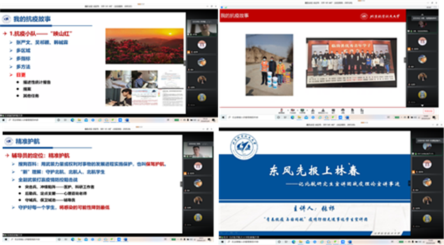 2019级硕士研究生王森:2020年的开端我们就迎来了一场挑战,新冠肺炎从湖北向全国蔓延,经过几个月的抗争,疫情得到了控制,我们也能稍稍松一口气。在这段疫情防控时间里,除了在一线奋斗的医护人员,也有许许多多的志愿者贡献着自己的一份力量。今天我们听了几位参与了家乡抗疫的同学的经历与感想,自己的心有所触动。原来自己“宅家”的同时,他们还在为抗疫做贡献,不免有一些惭愧。经过几位同学的分享,我们对疫情防控有了更直观的感受和了解。疫情虽然得到了控制,但离结束还不能放松,在未来的时间里以及返校之后,我们也要不松懈,积极配合学校的工作。