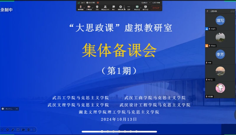 (通讯员刘念)10月13日(星期日)上午9:00-11:00,第1期“大思政课”虚拟教研室集体备课会圆满成功。“大思政课”虚拟教研室是由武昌工学院马克思主义学院牵头申报、经武昌工学院批准设立的跨校教研机构,希望整合各成员单位力量,立足二本高校实际,结合当前教育教学发展形势,以师资队伍建设为基础,以提升教师理论水平和教育教学能力为基本抓手,围绕“大思政课”,协同推进课程建设、教学改革,提升思政课教育教学效果。本次我校马克思主义学院副院长张桂芳、“德法”教研室主任余梦以及若干名思政教师参与其中。