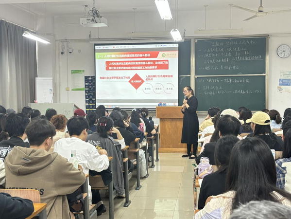 张桂芳老师本次授课的内容为《习近平新时代中国特色社会主义思想概论》课程的第四个专题“坚持以人民为中心”。从三个方面讲述了如何坚持以人民为中心,首先实现人民对美好生活的向往是我们党的奋斗目标,同时尊重人民群众的主体地位和首创精神,依靠人民在新时代创造伟业,最后指出党的执政水平和成效由人民来检验。江山就是人民,人民就是江山,我们还要落实以人民为中心的发展思想,做到坚持群众路线,为群众做实事,推动共同富裕取得更为明显的发展。授课过程中,张桂芳老师紧扣课程主题,引用鲜活具体的实践案例进行讲解,极富感染力和启发性,体现了她深厚的教学功底和勤勉的教学态度。