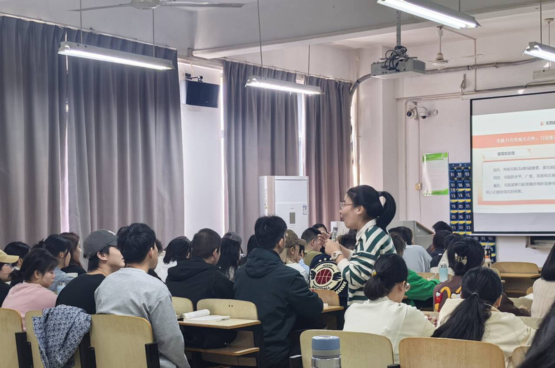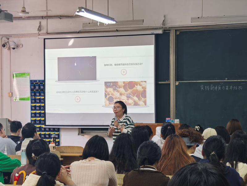 在课程伊始,余老师首先阐述了实践的含义。实践是人们能动地改造世界社会物质性活动,是人类自觉自我的一切行为。实践主体、实践中介和实践客体构成了实践的基本结构。通过这一阐述,学生们对实践有了初步的认识。随后,余老师详细讲解了实践的特征,包括客观实在性、自觉能动性和社会历史性。
