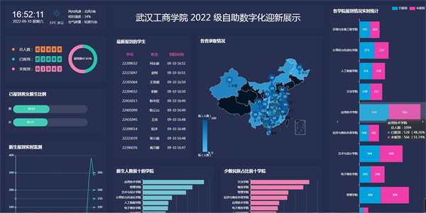 结合武汉市疫情防控形势和学校实际,为确保新同学安全报到,学校提前做了周密部署。迎新现场,在核验点工作人员的耐心引导下,大家按照事先安排好的入校流程,有序测温、核验身份信息、做核酸、入校……为确保迎新工作有序高效开展,学校还专门研发了自助数字化迎新展示系统,实时监测报到情况。