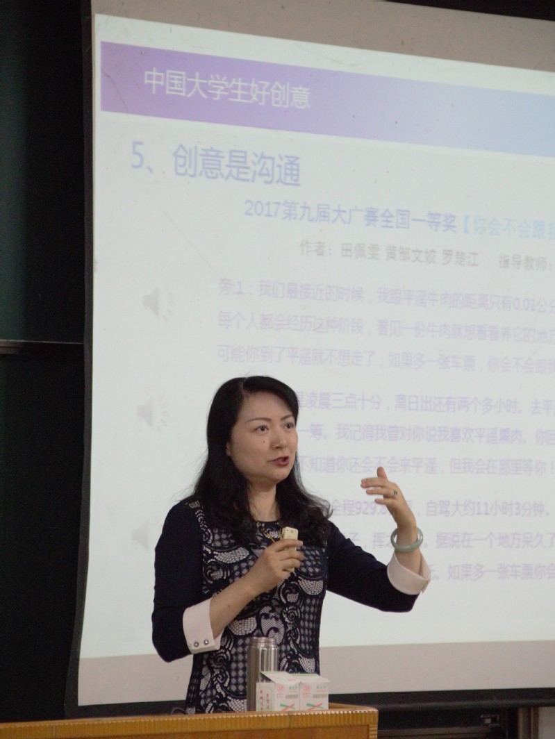 (通讯员 周惠珍)2018年5月24日下午2:30,受我院广告学系邀请,“大广赛”全国优秀指导教师王晔在综合楼207教室为我院师生进行了一场题为“创意 创新 创想——提升创意的思路和方法”的讲座。讲座现场座无虚席,人气爆满。参加此次讲座的有文法学院常务副院长刘润峰、广告学系系主任肖志芬,文法学院“大广赛”负责人罗青老师。