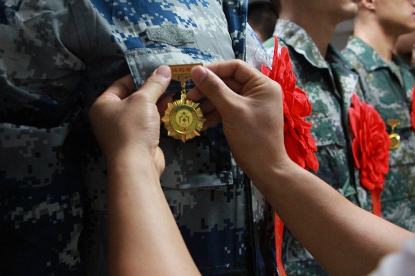 图为佩戴入伍纪念章环节 摄影:韦卓宜