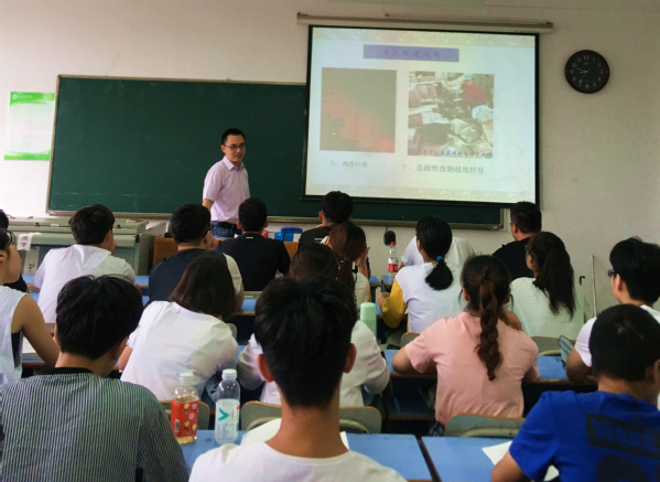 在外语楼415教室,青年教师吴俊锋正在上《环境化学》这门课,校长张安富教授坐在教室最后面,一边听课,一边认真记录课堂情况。课后,张校长主动跟授课老师交流听课的感想,在充分肯定吴老师教学效果的同时,提出了一些具体的建议,如本门课程的专业性词汇、重要概念较多,可通过强化课堂问答、学生课堂笔记等多种形式让学生进一步加深理解和印象。