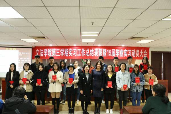 (文法学院迅 通讯员 许敬若)11月14日中午12点40分于综合楼第三会议室,举办了文法学院第三学期实习工作总结表彰暨19届毕业生实习动员大会。院长张金海教授、常务副院长刘润峰教授、党总支陈敏书记、华丽娜副院长、林翔院长助理、办公室主任吴琼老师以及各系系主任老师、三学期负责老师、教学秘书、辅导员老师及15、16级全体获奖同学和17级学生干部代表参加了本次会议。
