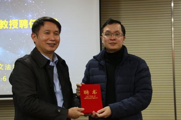 图为陈奎生校长颁发特聘教授聘书 摄影:谭艳