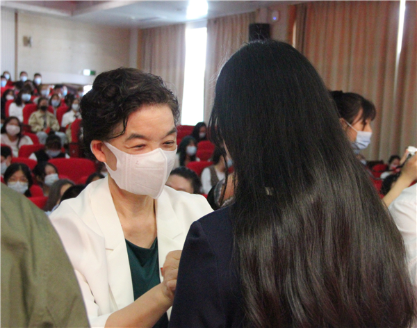 图为熊蕊校长为新生佩戴校徽 摄影:冯哲昊