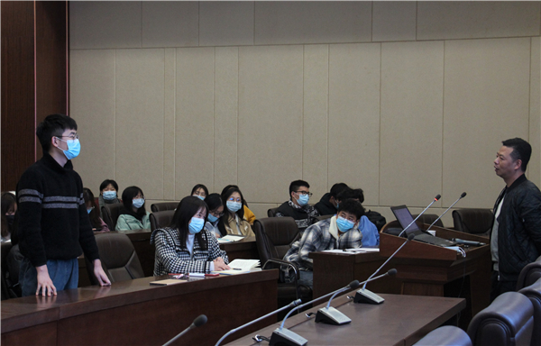图为管根稳正在回答学生提问 摄影:韩济泽