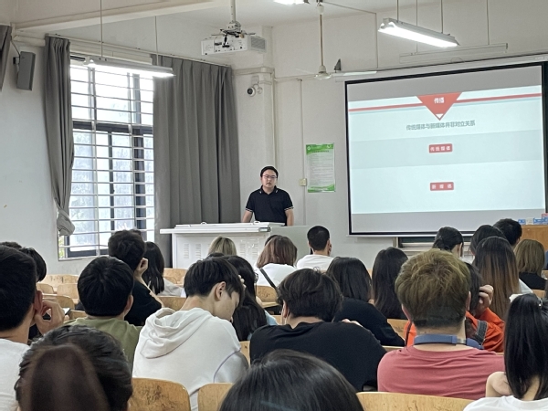文法新视野(记者:肖小月 摄影:雷颖茵)6月3日14:00在综合楼208教室举办了由字节跳动湖北公共事务总监肖杰老师为我们开展的“新时代的新媒体发展”主题讲座。