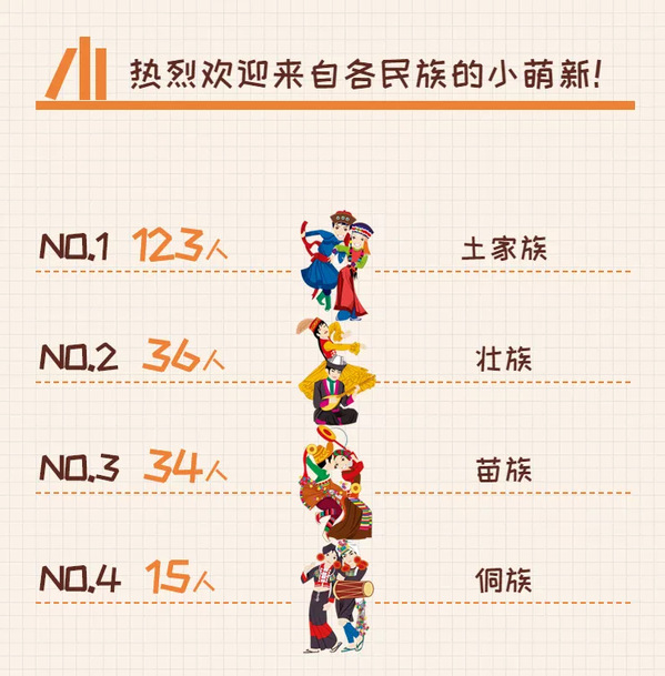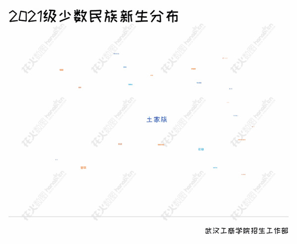 2021级新生中,汇聚了22个少数民族,共有279名少数民族新生。其中土家族人数最多,有123人;还有白族、藏族、鄂温克族、亻革(gě)家人、哈尼族、京族、柯尔克孜族、仫佬族、畲族等少数民族的小伙伴。