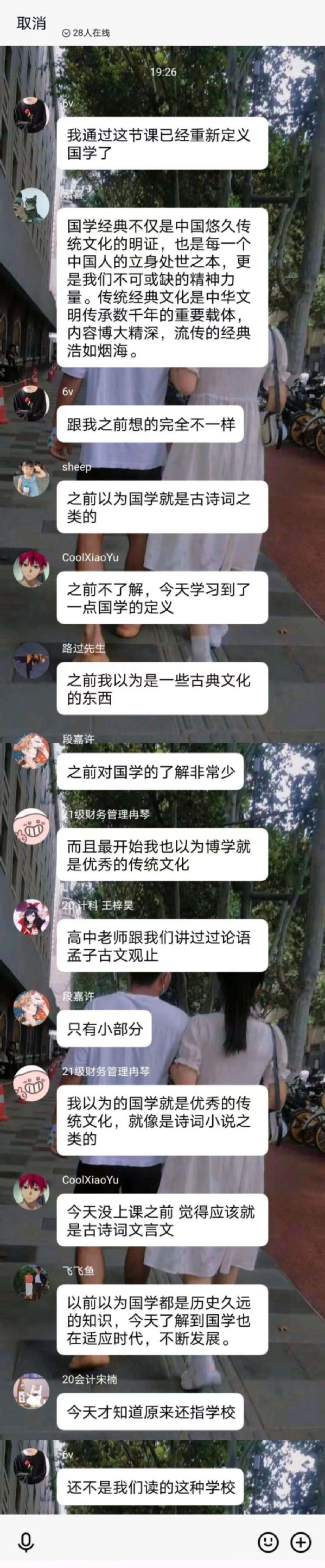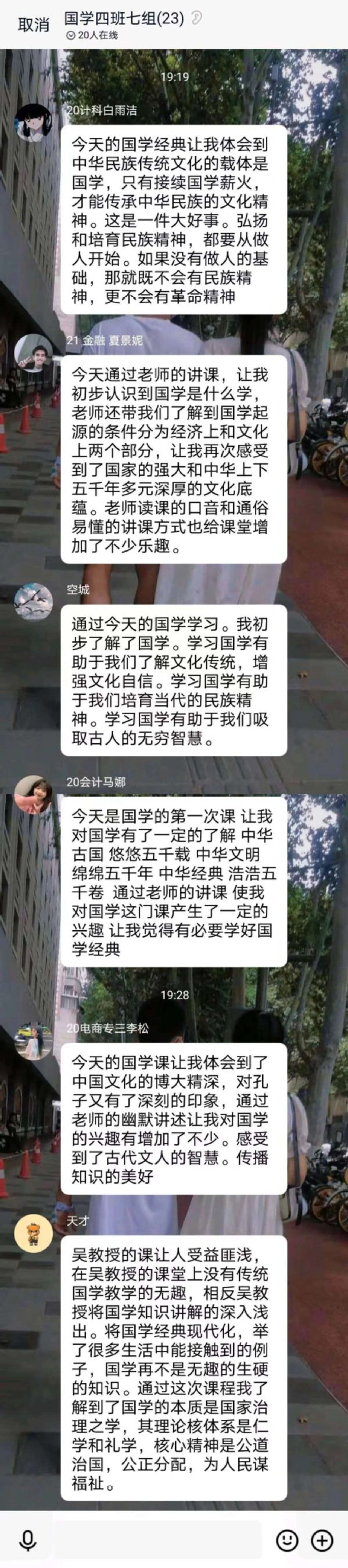 经济与商务外语学院2020级金融专业学生周淑敏感慨道:“很荣幸能有机会参加这次国学夏令营,听完吴天明教授的讲解后,我对国学有了进一步的理解,更体会到了国学的博大精深,教我们在这个嘈杂的社会学会保持初心、谦虚,更从容大气。”
