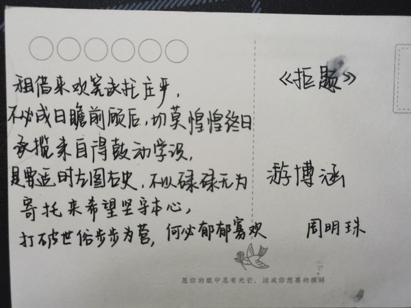 通过本次交换诗的作品征集,同学们可以以字传情,发挥自己的专业优势,用天马行空的想象,与他人的灵感碰撞出美妙的火花。可以感受到大学生健康的生活情趣,积极的生活理念,励志的价值观,用诗歌歌颂青春岁月。