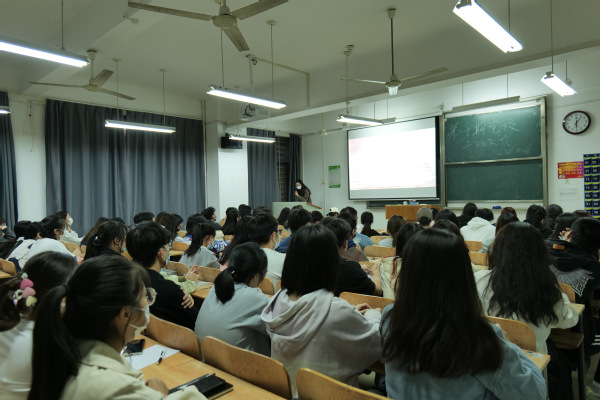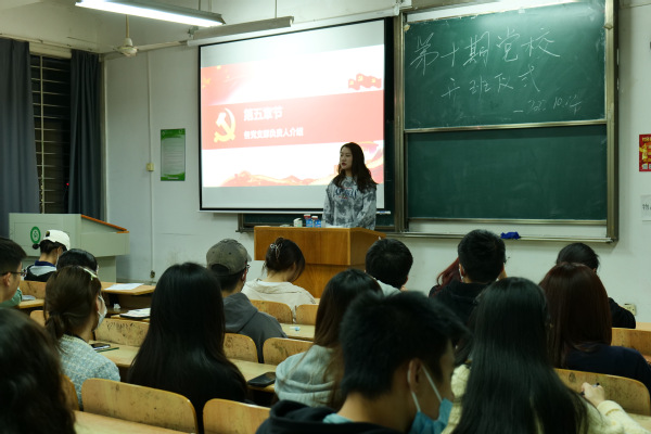 法学党支部组织委员李虹瑶上台强调了党校学员的模范带头作用,做好自己的同时要带领身边的同学一起学习、一起优秀。”