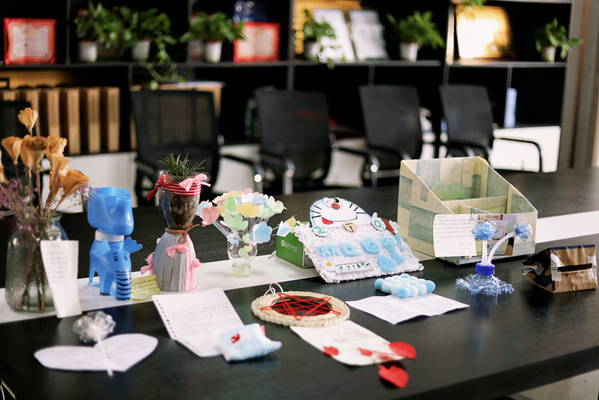图为“变废为宝巧利用,绿色环保我先行”活动中同学们利用可回收垃圾制作的工艺品