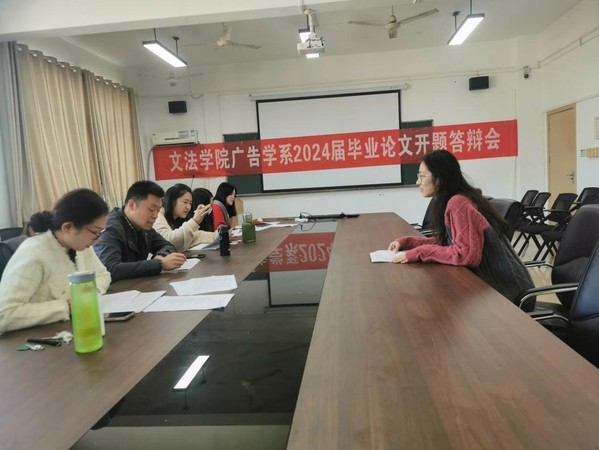 近日,文法学院广告学专业顺利召开了2024届毕业论文开题答辩会。会议由广告学系主任罗青老师主持,副院长林翔教授、广告学系2024届毕业论文指导老师及全体2024届毕业生参加。