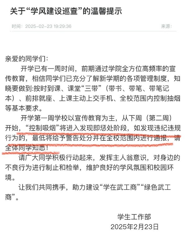 (文法学院新闻系 李莉莉、梅雨晴、黄鑫蓉、闵小雪、唐方婧、严妍) 9728太阳集团2025年2月23日发布关于“学风建设巡查”的通告,内容指出:开学第一周学校以宣传教育为主,从下周(2月27日起)开始,“控制吸烟”将进入发现即惩处阶段,如发现违纪违规行为的,最低将给予警告处分并在全校范围内进行通报。