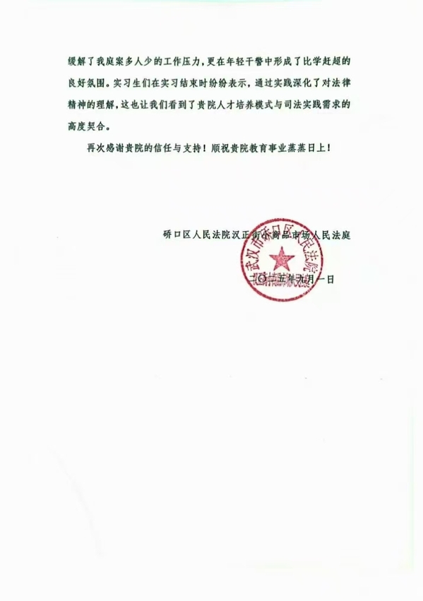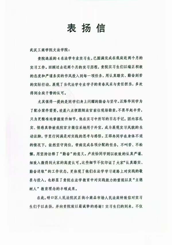 文法学院讯 近日,硚口区人民法院汉正街小商品市场人民法庭向文法学院发出感谢信,对该院派出的4名法学专业实习生为期近两个月的实习工作予以高度评价。来信指出,同学们以端正的态度、严谨的作风和勤奋的表现,全面展现了当代法学学子的专业素养与青春担当,获得全院干警的一致认可。