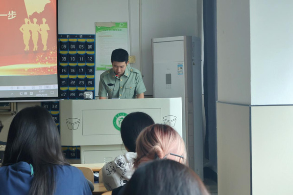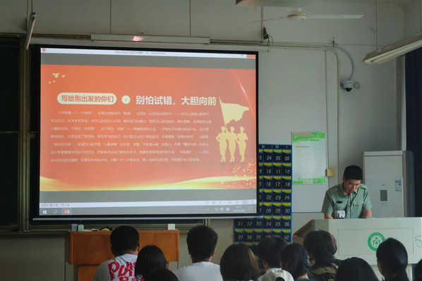 随后,田展学长将话题转向军旅生活,没有聚焦热血场面,而是通过叠“豆腐块”被子、三公里跑步、野外拉练三个日常故事,传递成长感悟。他回忆,刚入伍时因叠不好被子被当众批评,反复练习至手指磨破才明白“专业是把简单事做到极致”;三公里考核不及格时,在班长陪伴下每天提前训练,从“盯着终点”到“拆解小目标”,最终突破自我极限;野外拉练中,战友脚崴,全班合力分担装备、搀扶前行,让他懂得“真正的集体是有人掉队时愿意等一等”。这些真实细节,让新生深刻理解了“自律”“坚持”“责任”的内涵。