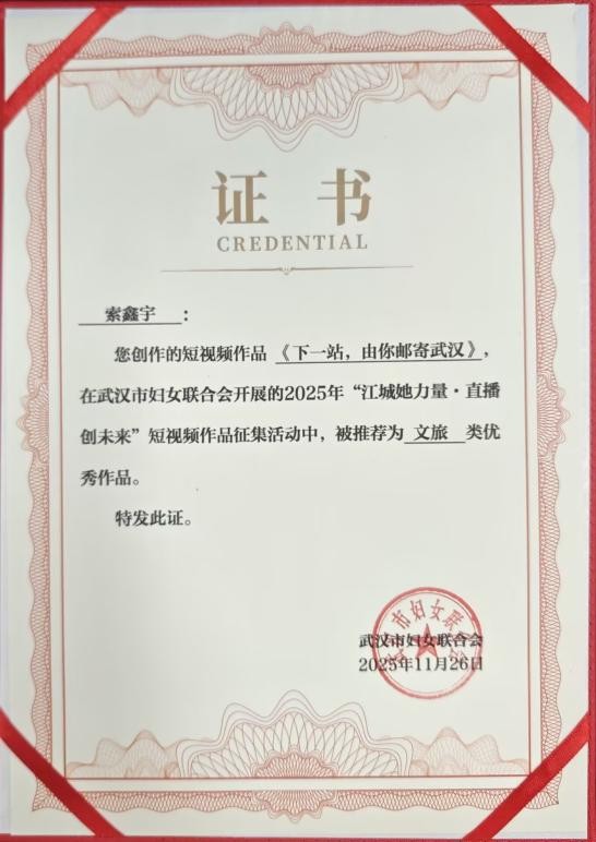 文法学院讯 近日,在2025年“江城她力量,直播创未来”短视频作品征集活动中,我院广告系学生索鑫宇,金杨两位同学带领的两个小组分别凭借创作的短视频作品成功被评为文旅类优秀作品和探店类优秀作品。此次活动由武汉市商务局,武汉妇女联合会,武汉广播电视台联合主办,主旨在于以镜头聚焦当代女性风采,挖掘并传递多元领域的“她力量”,同时展现武汉文旅魅力。