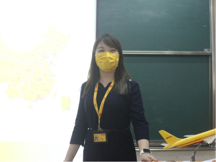 图为中外运-敦豪华中区销售部销售支持经理汪诗颖为同学们解答