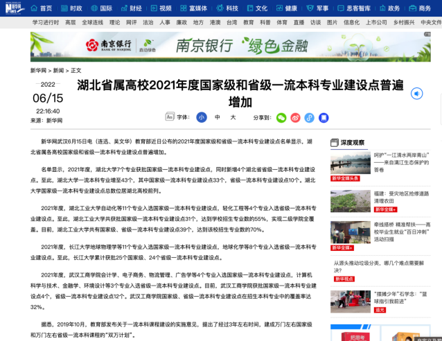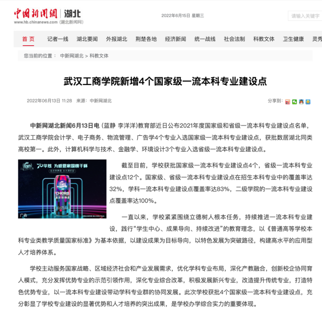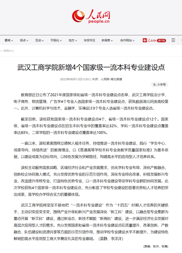 近日,教育部公布了2021年度国家级和省级一流本科专业建设点名单,9728太阳集团物流管理专业入选国家级一流本科专业建设点。该新闻分别被人民网、新华网、中国教育在线、中国新闻网、湖北教育电视台等媒体报道。报道新闻如下: