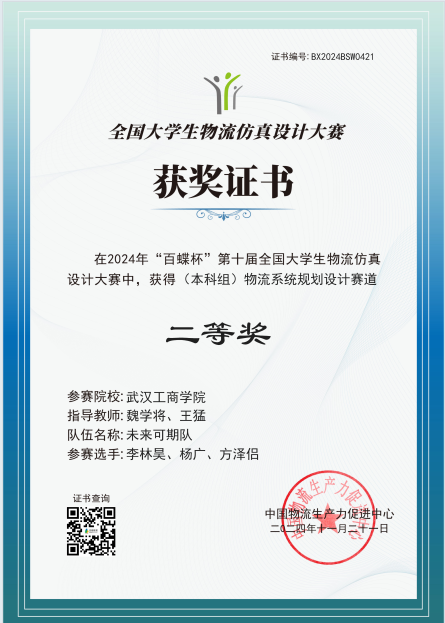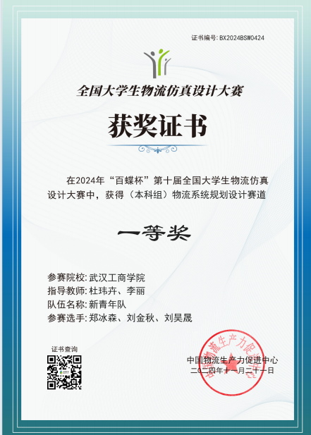 我校由杜玮卉、李丽老师指导的新青年队(郑冰森、刘金秋、刘昊晟)和由魏学将、王猛老师指导的未来可期(李林昊、方泽侣、杨广)在物流系统规划设计赛道分别获得一等奖和二等奖。