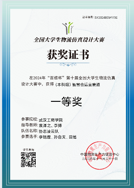 由袁泽之、李搏老师指导的协志凌云队(李铭煜、孙自天、田博)和由张龙、杜玮卉老师指导的做的对不队(杨铖煜、吴右辅、方涛)在智慧仓运营赛道分别获得一等奖和二等奖。