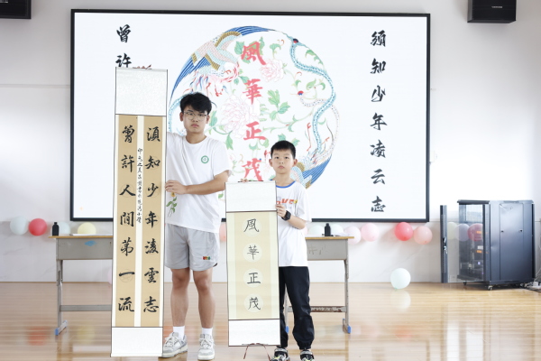图为志愿者和孩子在结课仪式上展示书法作品 摄影:周逸文