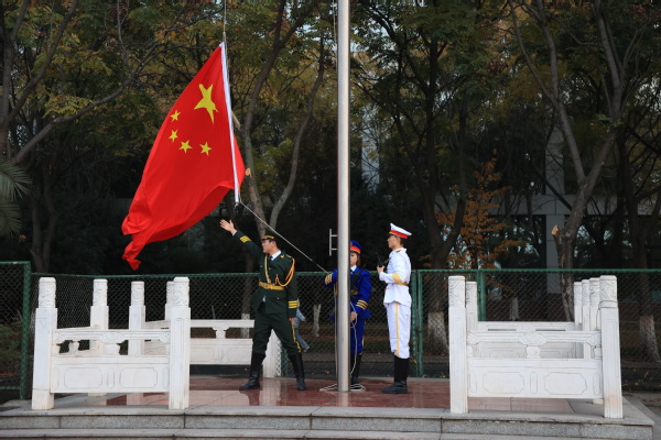 早上7点,迎着朝阳,国旗护卫队整齐划一、步伐铿锵,护卫着鲜艳的五星红旗入场。伴随着雄壮的国歌,旗手振臂一挥,鲜艳的五星红旗徐徐展开,在大家的注目礼中,迎风飘扬在校园上空。庄严的升国旗仪式感染着每一名学子,大家齐声高唱国歌,抒发心中的爱国情怀。