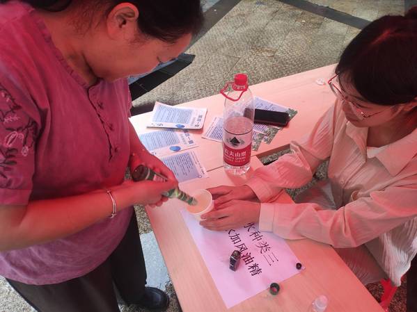 图为环境与生物工程学院“绿”动环生志愿服务队向居民科普驱蚊灭蚊知识