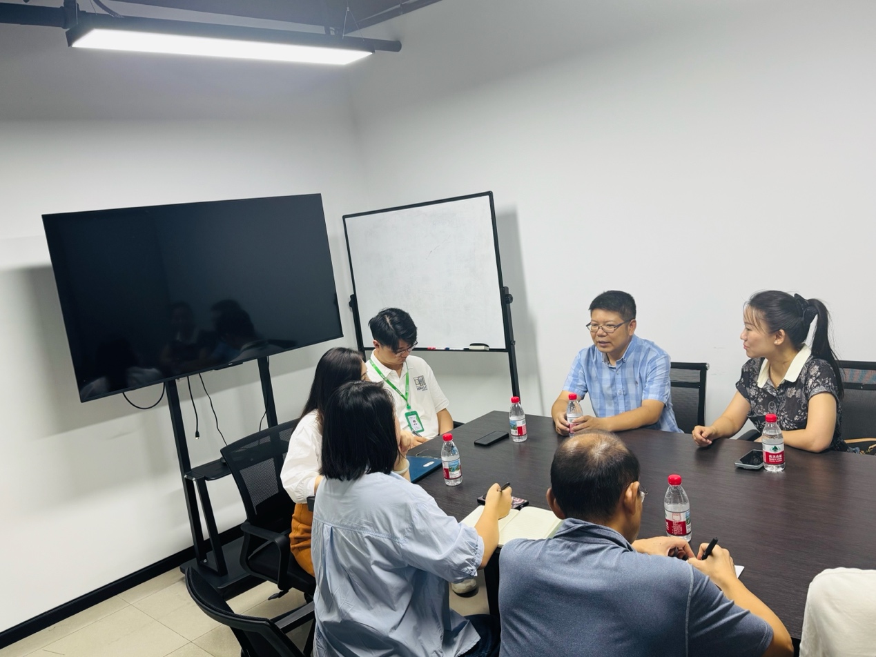 图为陈涛部长、张婷院长与企业副总经理江妍、行政人事主管夏勇进行会谈